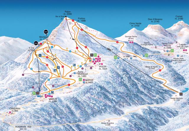 - jeden z najväčších ťahákov našej zimnej ponuky posledných rokov plne naplňujúci motto "za málo peňazí veľa muziky" čiže stredisko len za pár rokov vyskočilo z kategórie takmer neznámych medzi tie vôbec najžiadanejšie#- ojedinelá návratnosť klientov, porovnateľná snáď len s Val di Fiemme a Santa Caterinou#- lyžiarske terény ideálne úplne pre všetkých, vďaka svojej celistvosti, ale predovšetkým pre rodiny s deťmi a menej až stredne zdatných lyžiarov#- celková lyžiarska plocha cez 70 hektárov a teda priemerná šírka zjazdoviek 33 metrov, čiže mimo víkendy a hlavnú sezónu na svahu skoro sami a ďalší lyžiari v nedohľadne#- nezabudnuteľná úžasná zjazdovka "Gran Pista" (v preklade "Veľká zjazdovka"; na skimape písmeno D), radí sa vďaka svojej dĺžke cez 3,5 km a priemernému sklonu 38 % k jednej z najlepších zjazdových tratí v regióne Trentino#- na Taliansko ojedinele rozsiahla ponuka pre snowboarding vrátane halfpipe olympijských rozmerov, boadercrossu (pri zjazdovke značené na skimape O) a mnohých ďalších lákadiel#- k samej dokonalosti prepracovaná úprava zjazdových tratí a s výnimkou odporúčaných voľných terénov stopercentné pokrytie areálu systémom umelého zasnežovania, čiže maximálna garancia kvalitného a pestrého lyžovania aj v okrajových termínoch sezóny#- pohodlné prepravné zariadenia pozostávajúce, ak pominieme 4 pojazdné koberce pre najmenších návštevníkov, výhradne zo sedačkových lanoviek vrátane modernej vysokokapacitnej sedačky s jedným z najväčších prevýšení v Európe (809 metrov; na skimape číslo 4) útorkové a štvrtočné nočné lyžovanie na zjazdovkách Cordela, Lavaman, Diagonale Montesel a v snowparku#- pár rokov späť nová šesťmiestna sedačková lanovka na Montesel nahradzujúca pôvodné dve súbežné dvojsedačky, teda zvýšenie hodinovej prepravnej kapacity lanoviek na 6.100 osôb#- zo sezóny pred dvoma rokmi nový osvetlovací LED systém pri zjazdovkách Cordela a Montesel a tiež nový pojazdný koberec pre deti vo Vasone, tento rok potom ďaľšie dva ,,kúzelné koberce"#- nedávna úspešná novinka v podobe možnosti lyžovať 1 deň na Paganelle a 1 deň vo Folgarii, avšak len v rámci 6-dňového skipasu#- detský park a pravidelné popoludňajšie animácie vo Vasone, teda napr. hudba, súťaže a iné aktivity#- dlhoročná tradícia lyžiarskeho športu, datujúca sa postavením prvého lyžiarskeho vleku k "neuveriteľnému" roku 1934#- ľahko a rýchlo dosiahnuteľné centrum Trenta, mesta, ktorého základy siahajú až do 5. storočia pred naším letopočtom čiže unikátna kombinácia alpského lyžovania s históriou a kultúrou veľkomesta#- len 725 km z Prahy a 790 km z Brna a okrem posledných 15 kilometrov stále po diaľnici#- prevažná väčšina ubytovacích kapacít takmer na svahu a po celú sezónu ponuka krátkodobých pobytov na 3 a 4 noci#- ale hlavne tie stále neskutočné ceny ako apartmánového, tak predovšetkým veľmi kvalitného hotelového ubytovania |