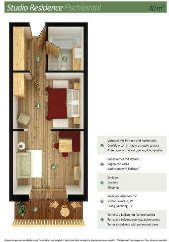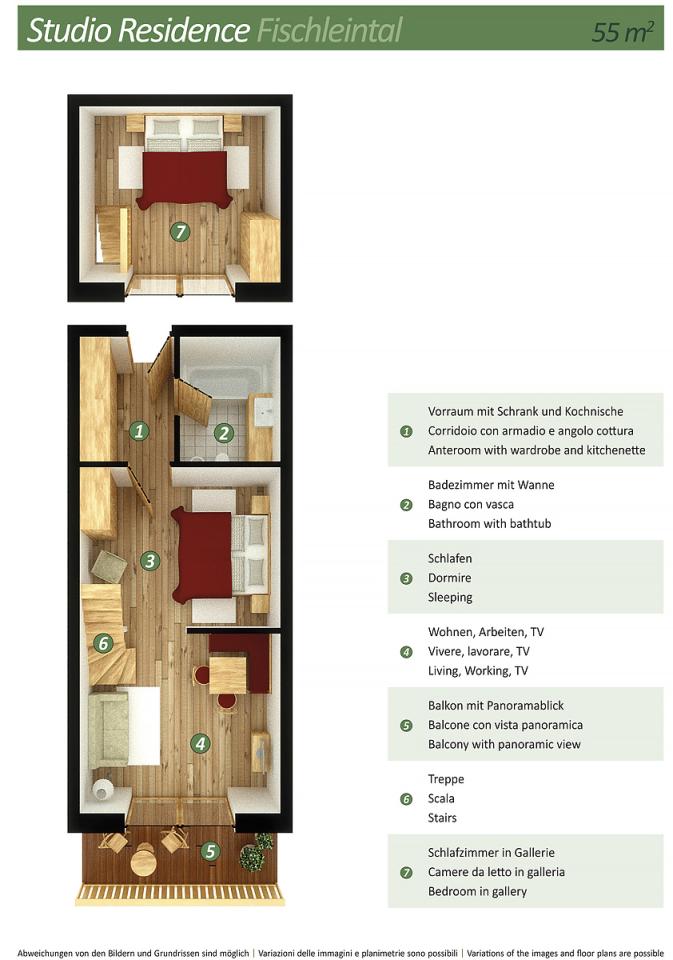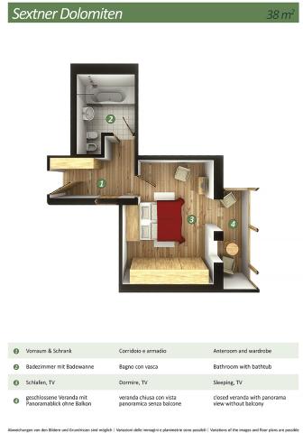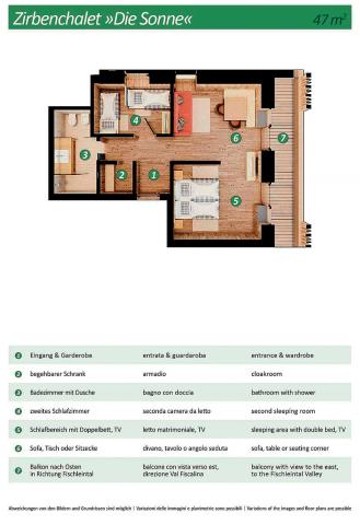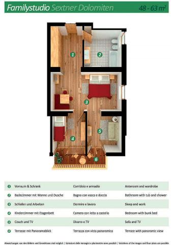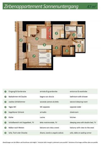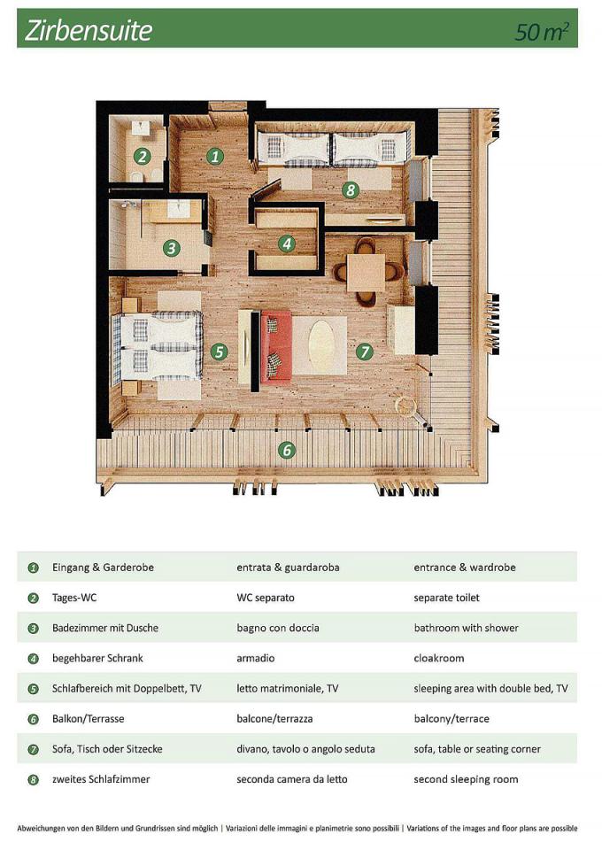 gaučom pre 1 osobu, sociálne zariadenie so sprchou, balkón #Dolomiti di Sesto 2/3: 28 až 35 m² - izba s manželskou posteľou a prípadne rozkladacím gaučom pre 1 osobu, sociálne zariadenie so sprchou alebo vaňou, balkón #Zirbenchalet II Sole 2/3/4: 47 m² - izba s manželskou postelou, izba s 2 samostatnými lôžkami, sociálne zariadenie so sprchou, balkón #Zirbenappartment Tramonto 2/3/4: 47 m² - izba s 2 samostatnými lôžkami, obývacia izba s manželskou posteľou a uzatvárateľným kuchynským kútom, sociálne zariadenie so sprchou, 1x WC naviac, balkón #Studio Larice 2/3/4: 40 m² - izba s manželskou posteľou a prípadne rozkladacím gaučom pre 2 osoby, sociálne zariadenie so sprchou, balkón či terasa #Studio Larice Mezonet 3/4/5: 55 m² - izba s manželskou posteľou, izba s manželskou posteľou a rozkladacím gaučom pre 1 osobu v rámci zvýšeného poschodia, sociálne zariadenie so sprchou, balkón či terasa #Zirben Suite 2/3/4: 50 m² - izba s manželskou posteľou, izba s 2 samostatnými lôžkami, sociálne zariadenie so sprchou, balkón či terasa #Family Studio Monte Elmo 3/4/5: 48 m² - izba s manželskou posteľou a rozkladacím gaučom pre 1 osobu, izba s 2 samostatnými lôžkami či poschodovou posteľou, sociálne zariadenie so sprchou, balkón #Family Studio Dolomiti Sesto 3/4/5: 48 m² - izba s manželskou posteľou a rozkladacím gaučom pre 1 osobu, izba s 2 samostatnými lôžkami či poschodovou posteľou, sociálne zariadenie so sprchou, balkón |