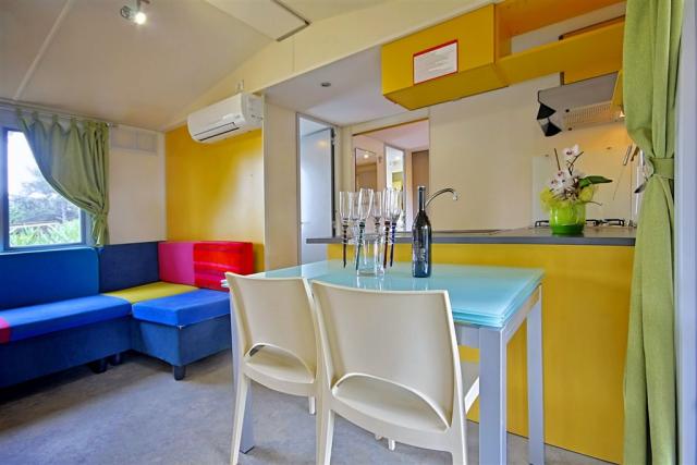 klimatizované mobilní domky - typ M. HOME 4(+1) OLIVA - cca 34 m2 - dvě 2lůžkové ložnice, jedna s manželskou postelí (160 x 200 cm), druhá s oddělenými lůžky (80 x 200 cm), denní místnost s rozkládacím gaučem, vždy vybavený kuchyň. kout, sprcha a WC, TV, terasa se zahradním nábytkem. |