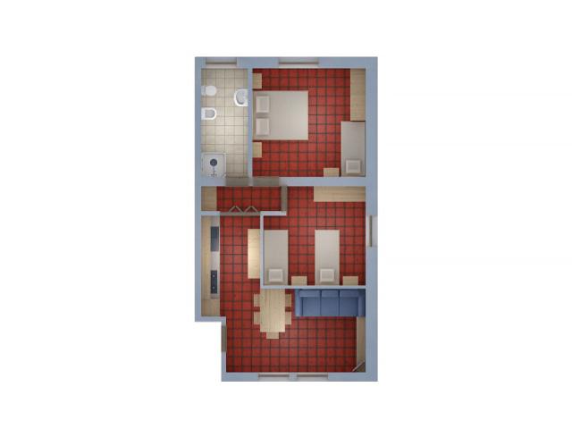 #quadrilo 7: 85 m² - 1 spálňa s manželskou posteľou, 1 spálňa s manželskou posteľou a 1 ďalším samostatným lôžkom, 1 spálňa s 2 samostatnými lôžkami, obývacia izba s kuchynským kútom, 2x sociálne zariadenie, balkón, veľká krytá terasa s výhľadom na jazero; apartmán sa nachádza na 1. poschodí