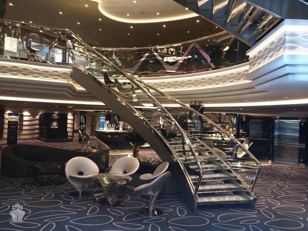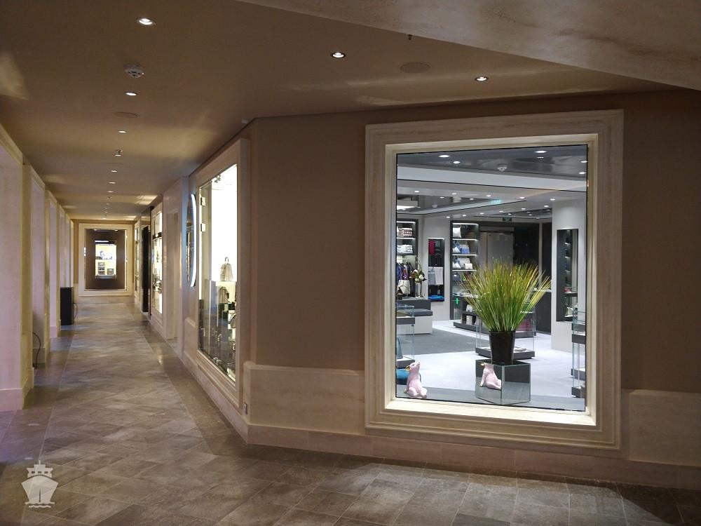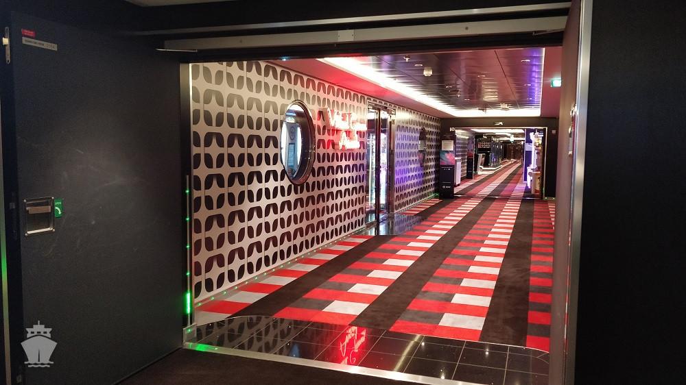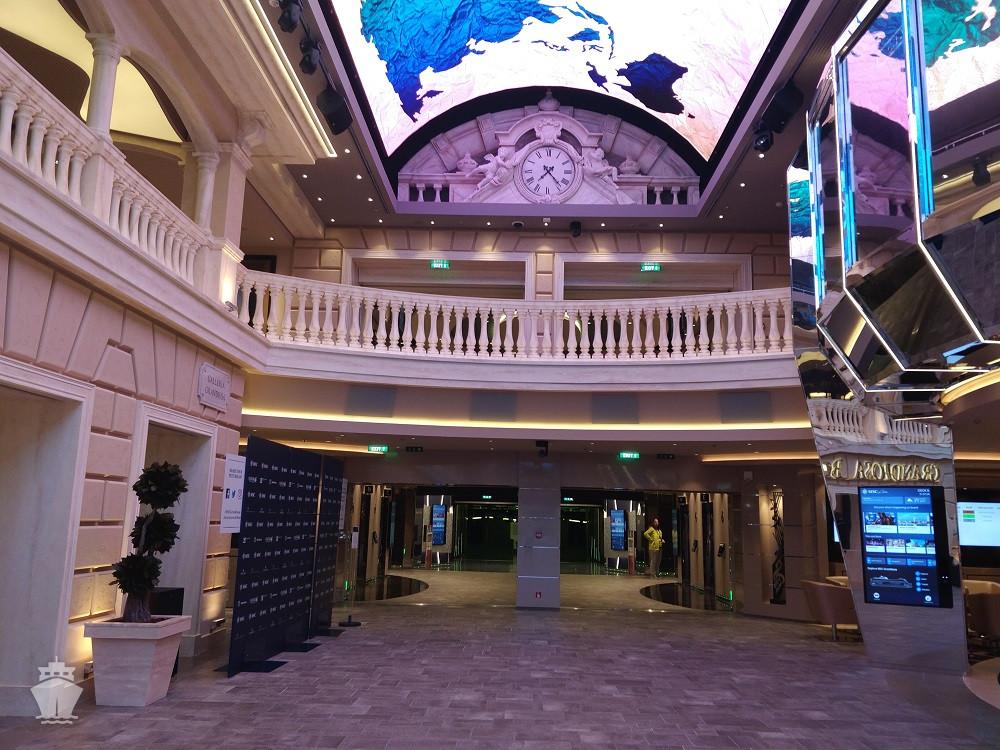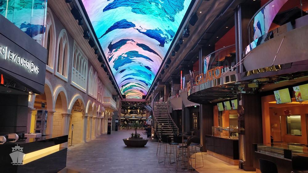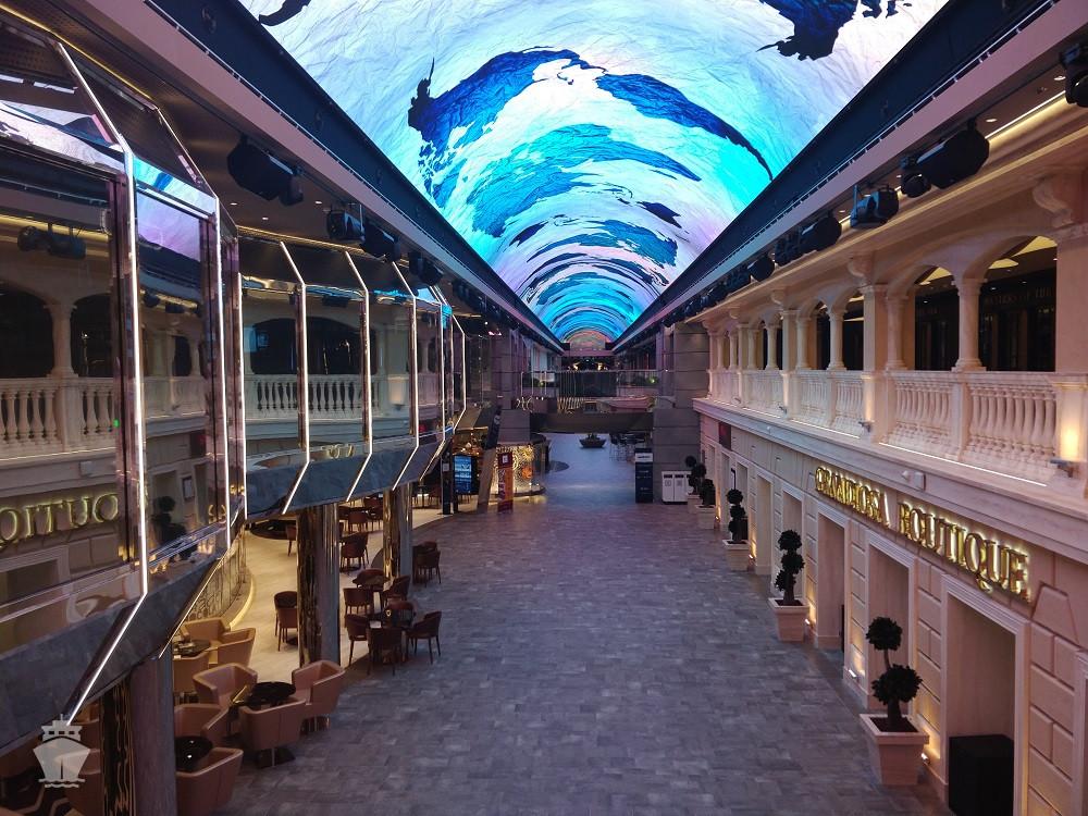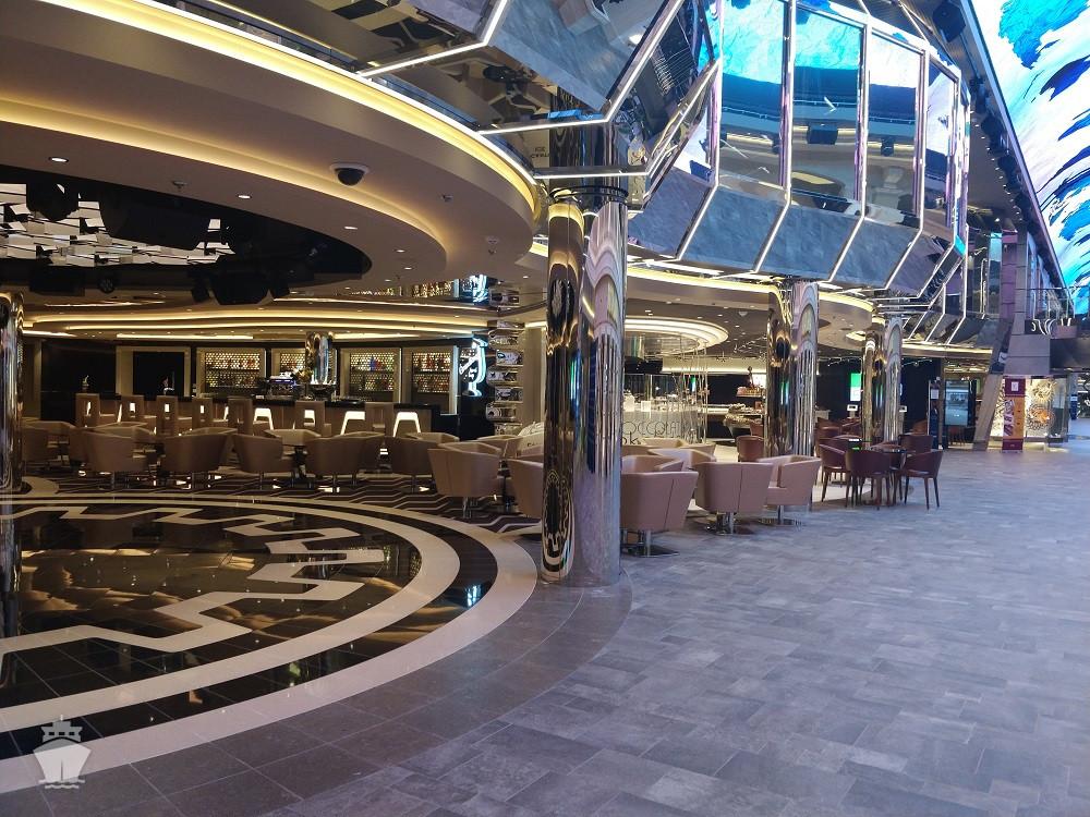 • Dvojúrovňová promenáda s reštauráciami, barmi a duty-free obchodmi, zastrešená 480 m² LED "digitálnou oblohou" s vizuálnymi show