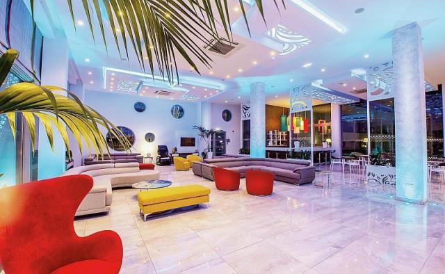 Vstupná hala s recepciou, zmenáreň, výťahy, reštaurácia s terasou, bary, vonkajší bazén, terasa na slnenie s ležadlami a slnečníkmi zadarmo.