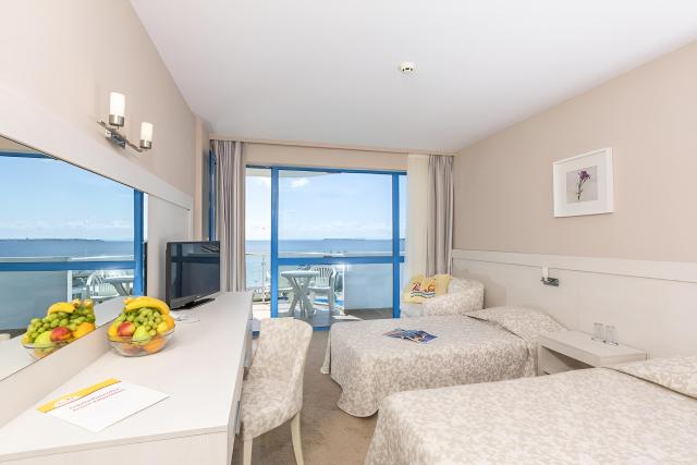 Dvojlôžková izba: kúpeľňa/WC (sušič vlasov), klimatizácia, TV/sat., telefón, chladnička, balkón alebo terasa, výhľad na more