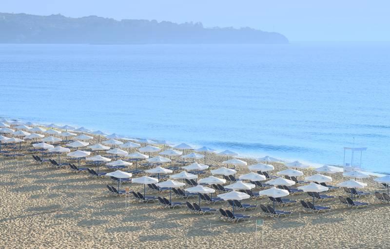 nádherná piesková pláž 250 m od hotela • pozvoľný vstup do mora • bezplatný plážový servis • súkromné pavilóny za poplatok • centrum vodných športov za poplatok